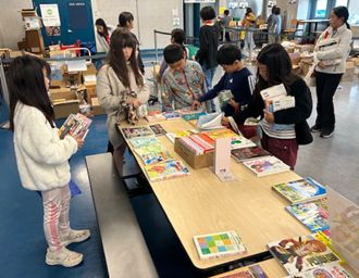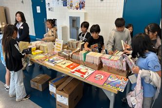 カフェテリアの机の上に、所せましと日本語の本が並びました。ご寄付いただいたり、保護者の皆さんが一時帰国時に手に入れて、持って帰ってきてくださったり。有難いことです。しかも2冊で1ドルなんて破格ですね。みんなもここぞとばかりにあれも、これもと手に取って、抱えている本は今にも落ちそうです!